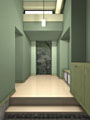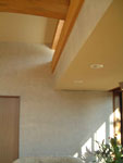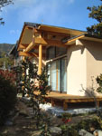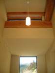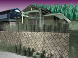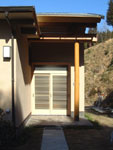 | 「羽様(はざま)の家」 山口県光市に建つ小さな住宅。「羽様」とはこの敷地の屋号であるが、山とたんぼの「間」、空と大地の「間」の意味で「羽様(はざま)の家」である。 プランニング上の施主の要望はリビング、ダイニング、キッチン、和室等、一般的なもので、敷地が西側に開けており、眺望を活かしたいこと、北側に庭を造り、それを玄関からの借景にしたいとのこと。平屋建てであるため、すべての部屋に開口部をとるのが難しい。そこで屋根を2段にし、屋根と屋根の隙間から光、風を取り入れられるように断面の計画をした。 屋根を2段にするために挟み桁を採用している。通常、柱の上に桁を載せるわけだが、ここでは2本の桁で柱を挟み、ボルトでとめる。その桁を2段にし、上下の屋根をそれぞれ支える。またその上下の桁でタイコ挽きの松丸太を挟み、意匠的にも現している。 耐力壁はすべて構造用合板にしており、軸組み工法ではあるが、2×4のように壁が主要な構造となっている。その上に挟み桁と松丸太の小屋組みが載っているイメージで設計した。 |